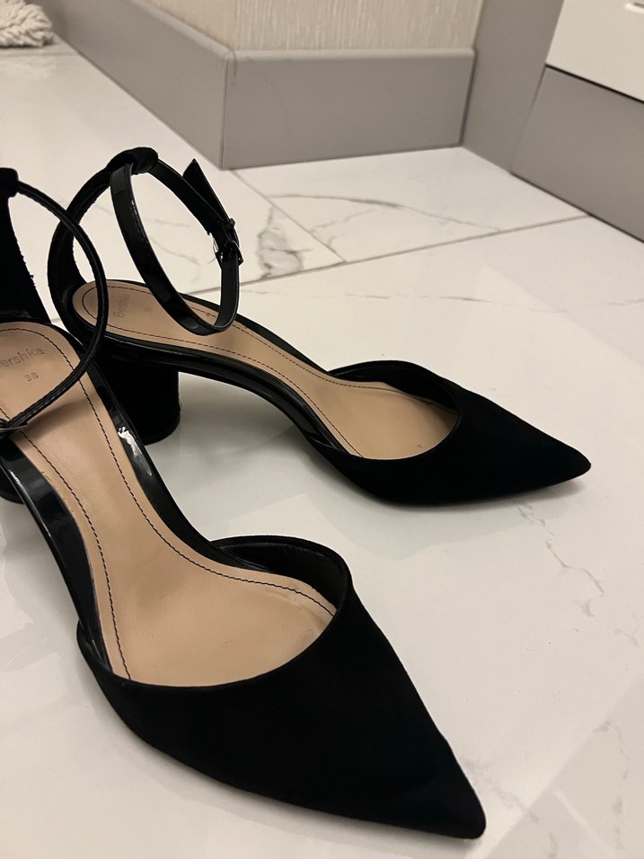 Tokalı bilek kayışı ve sivri burunlu siyah süet stiletto, romantik akşamlar için şık ve zarif.38 numara