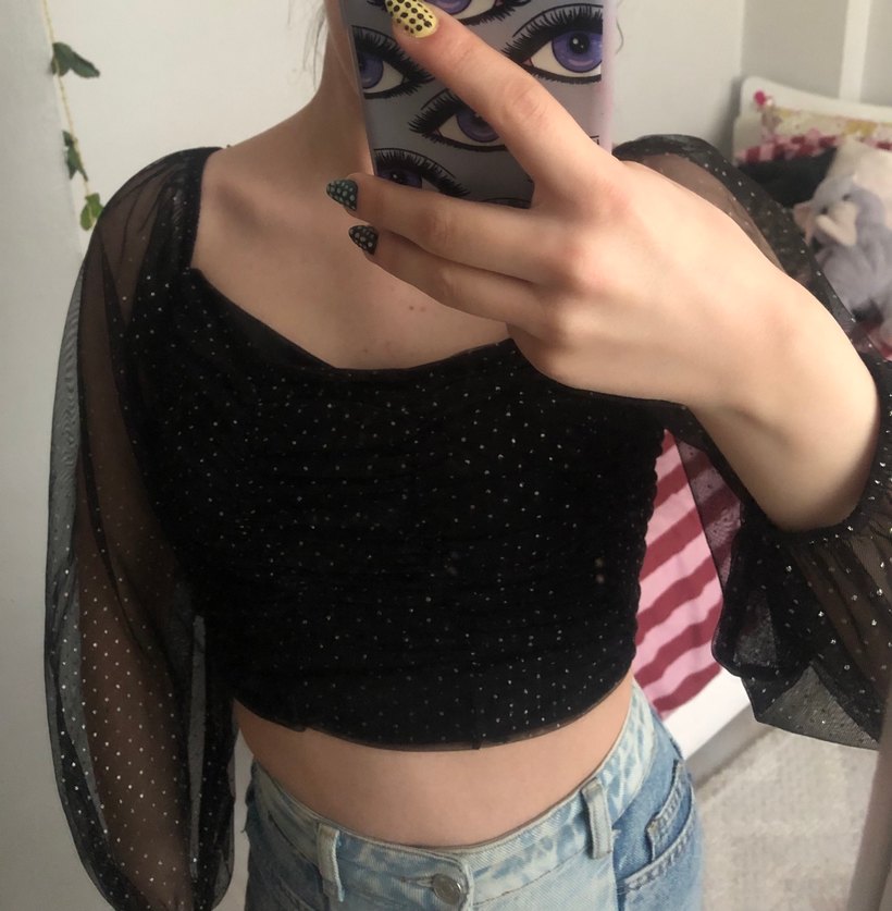Bershka Siyah tül kollu crop bluz