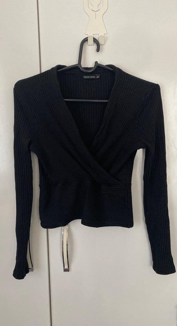 Siyah, uzun kollu, V yakalı, triko dokulu, normal boyda, fit kesim kadın bluz. Bir kusuru yok, severek aldım ama bende beklediğim gibi durmadı.