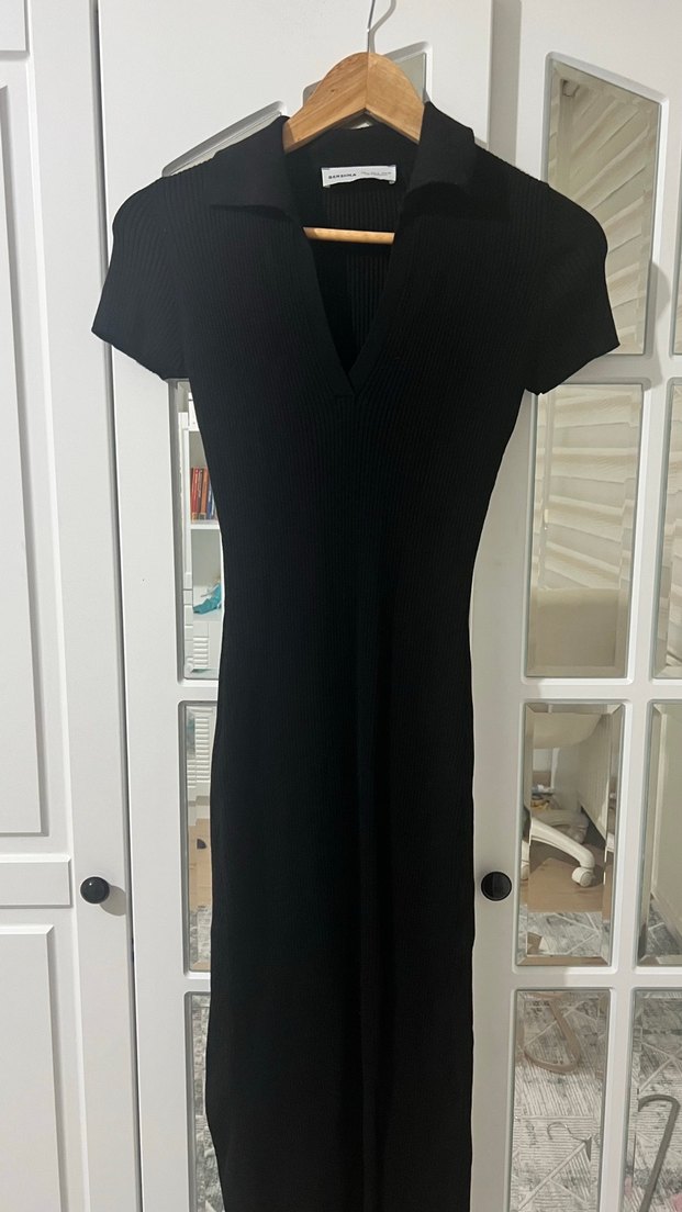 Drapeli tasarıma sahip, V yakalı ve kısa kollu siyah uzun triko elbise, yumuşak sentetik kumaştan yapılmıştır ve minimalist gotik tarzı yansıtır.