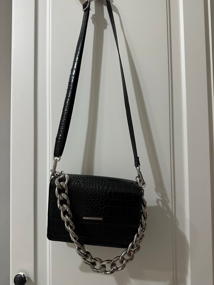 Bershka marka deri zincir detaylı siyah çanta. Hem çapraz model hemde kol çantası olarak takılabilir. Hiç kullanmadım.