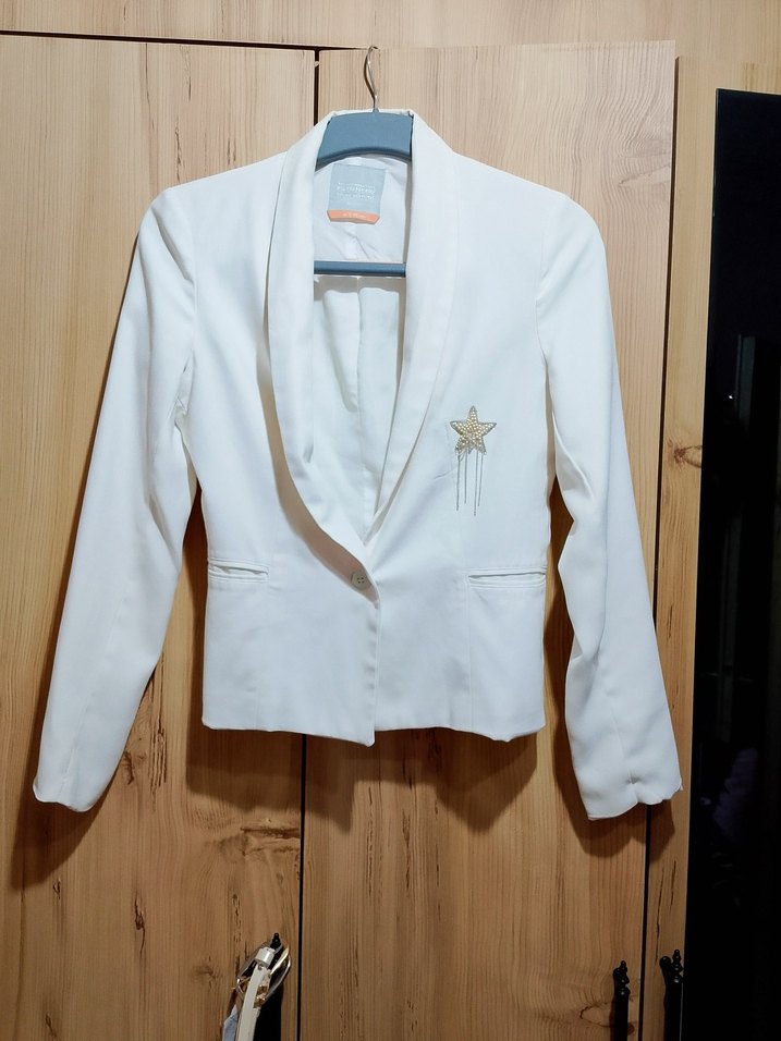 Düğmeli beyaz slim fit blazer, yakalı ve uzun kollu, yıldız broş detaylı. Ofis kullanımı için çok şık