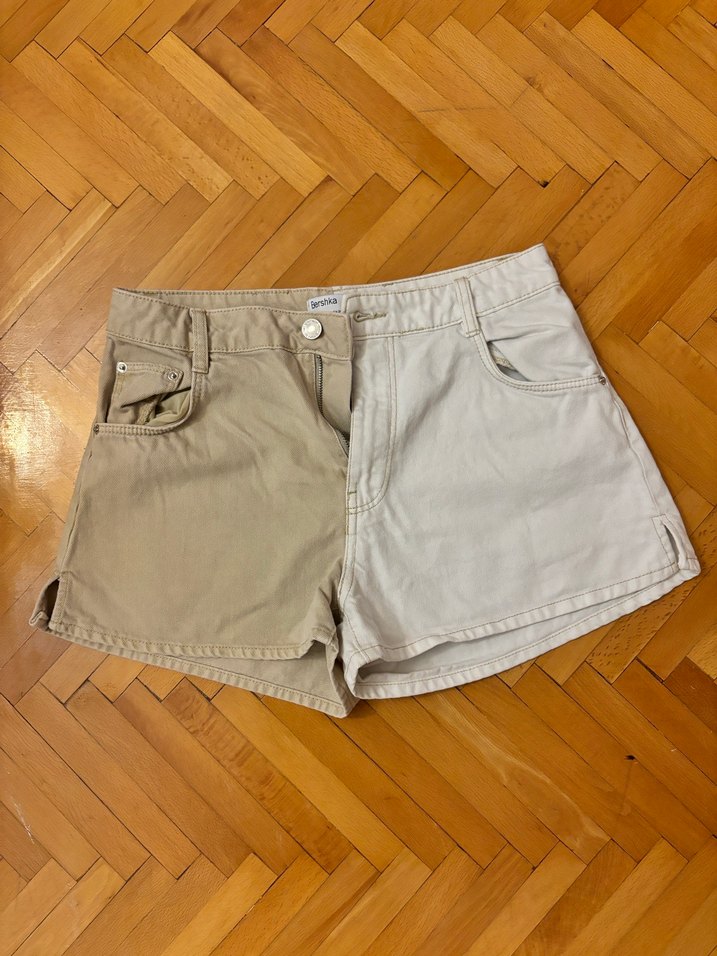 Kadınlar için iki renkli bej ve gri denim mini şort, bol kesimdir. Çok az giyilmiştir. #bershka #inditex #y2k #şort