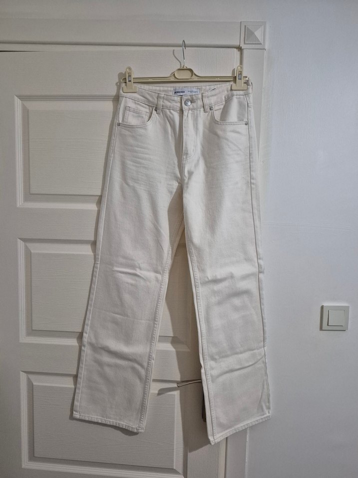 Bershka marka, 38 beden, ekru renk, yüksek bel straight fit jean. Geçen yaz aldım ancak hiç giymedim.