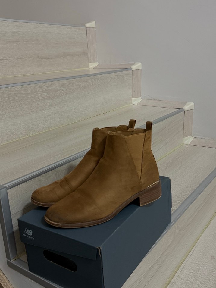 Kahverengi süet, parlak görünümlü kadın botları, kalın topuk ve tokalı detaylara sahiptir. Minimalist tasarım, günlük sokak stili için uygundur. Topuk kısmında ufak deformasyonlar mevcuttur.