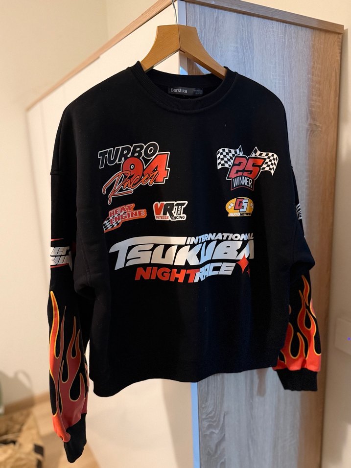 Siyah, baskılı ve uzun kollu bu oversize sweatshirt, alev desenleriyle dikkat çeker. Bisiklet yaka ve örme sentetik kumaştan üretilmiştir. Sadece 2 defa koşa süreşi kullanılmıştır.