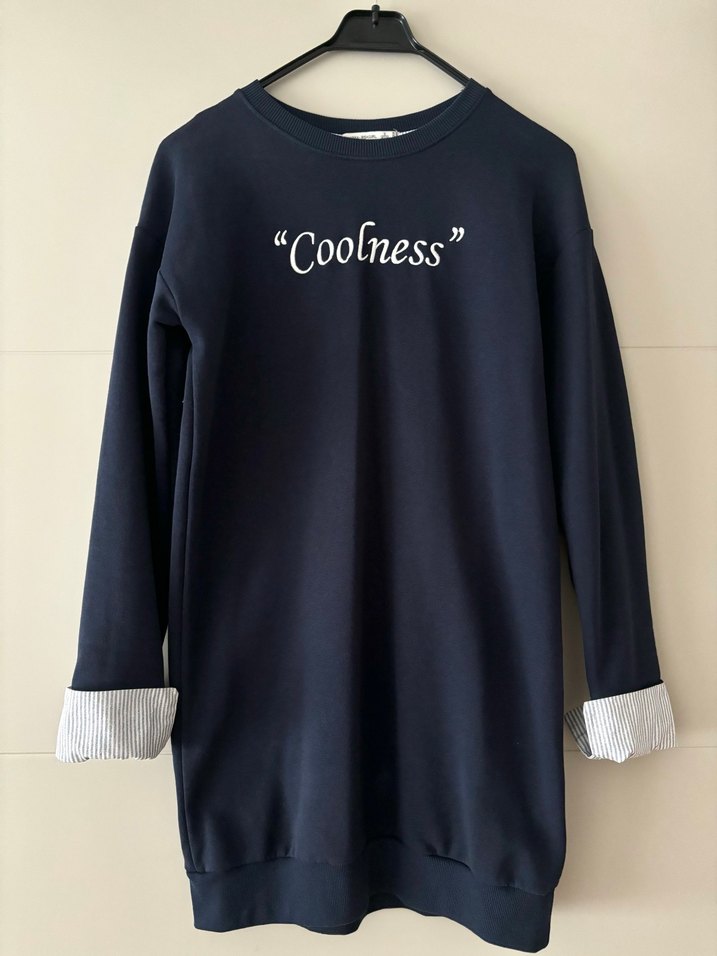 S. Lacivert. Kol altından göğüs genişlik: 48 cm, boy: 81 cm. Manşetlerde mavi/beyaz gömlek kumaşı detaylı. Sorunsuz. #bershka #sweatshirtelbise