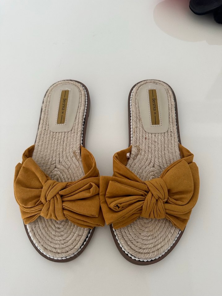 Hardal renkte, fiyonk detaylı ve kadın terliği. Sentetik kumaştan yapılmış, rahat ve bohem tarzda, günlük kullanım için uygundur. Hiç kullanılmadı.