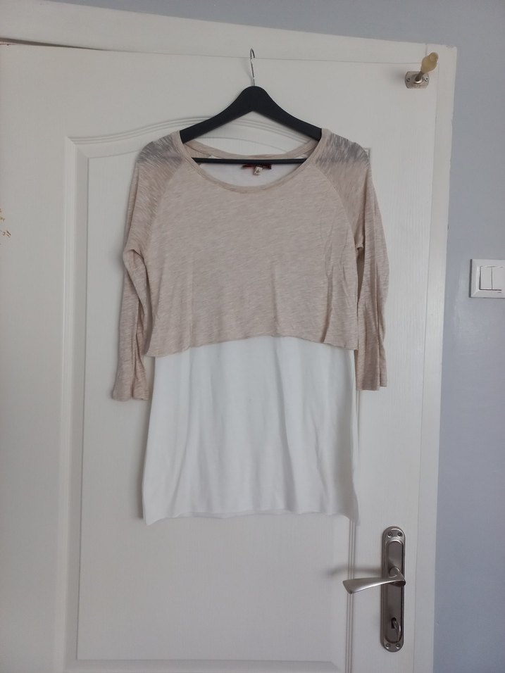 bershka penye tişört. önünde biraz tüylenmesi var. dar kalıp 38 bedene daha uygun Iki koltuk arası 45 cm Boyu bej 39 cm beyaz 73 cm Kol boyu 45 cm