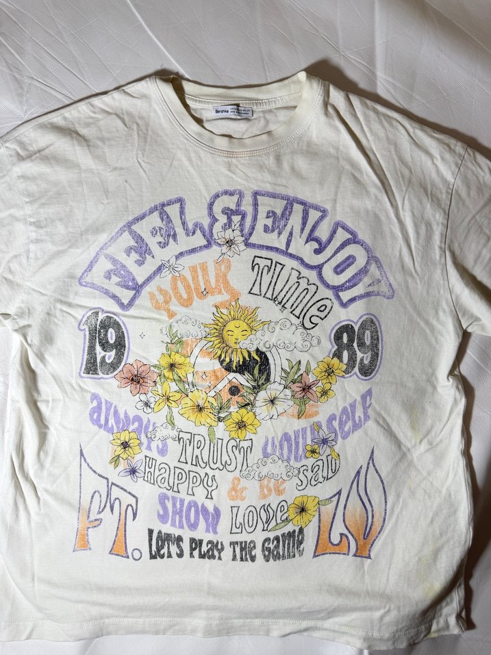 Oversize kesimi sayesinde çok salaş ve havalı duruyor, her taytın veya jeanin üzerine harika oluyor. Tişörtü severek kullandım; fotoğraflarda (özellikle sağ alt kısımda) görebileceğiniz üzere kullanıma bağlı bazı hafif lekelenmeler ve renk değişimleri mevcut, bu yüzden fiyatını çok uygun tutuyorum. Rahatlığından ödün vermeyenler için hala çok keyifli bir parça, şimdiden yeni sahibine neşe getirsin! ✨