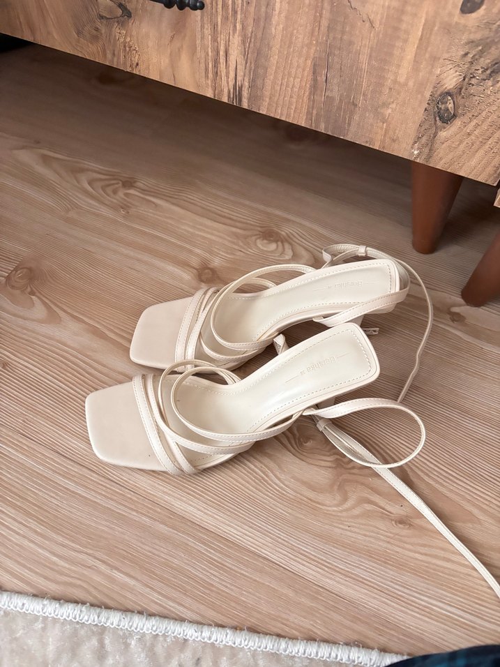 Beyaz ince bantlı, minimalist tasarımlı stiletto topuklu kadın sandalet. Kauçuk malzemeden, bohem ve klasik zarafeti yansıtan, düğünler için uygun bir model. 1 kere kullanıldı.