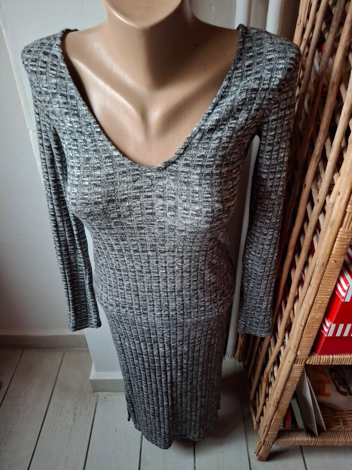 V yakalı, uzun kollu, gri triko kumaştan yapılmış, vücuda oturan uzun kadın elbisesi. S beden.