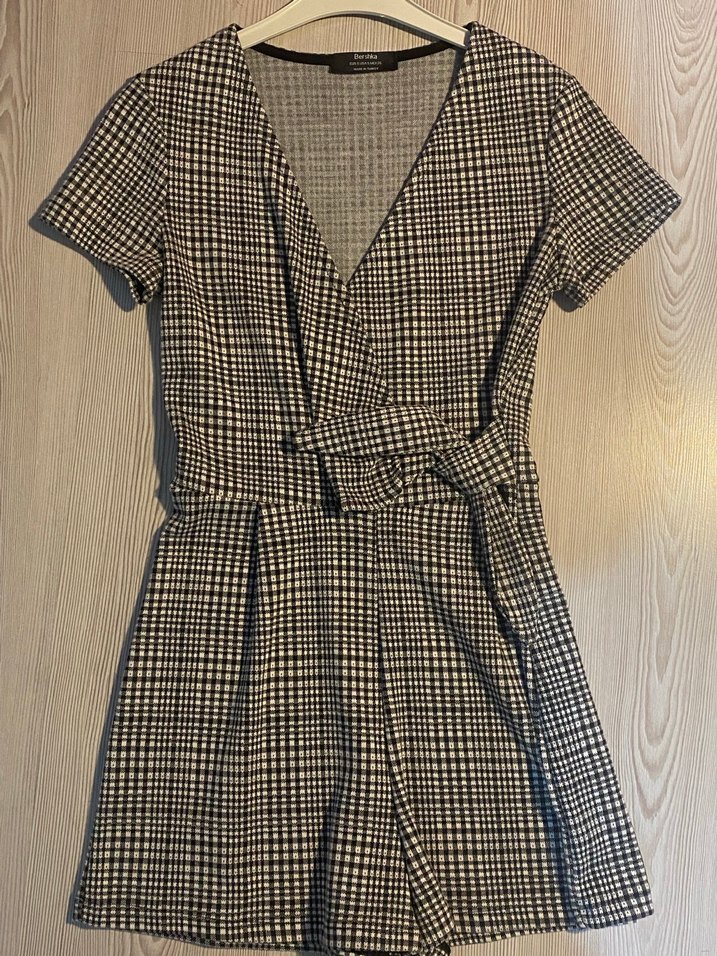 Kadınlar için kemerli, V yaka ve kısa kollu, gri kareli kısa tulum. Sentetik kumaştan, fit kesim ve günlük rahat stil için uygun.