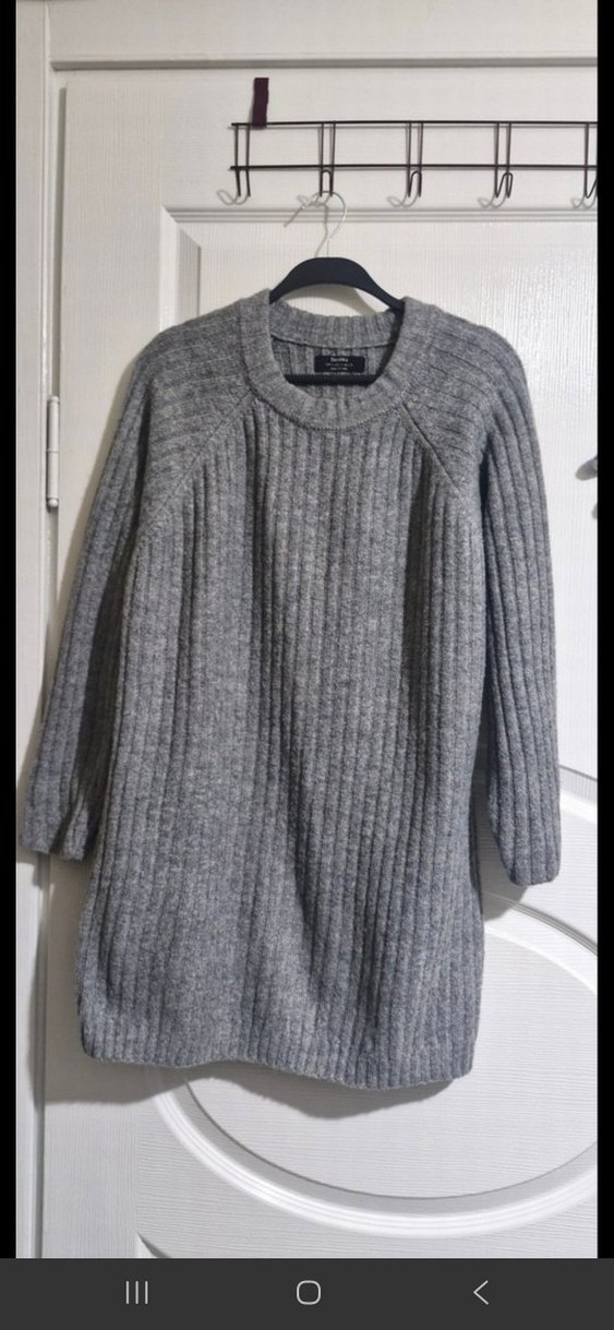 Bu gri triko kadın kazak, bisiklet yaka, uzun kollu ve bol kesimiyle günlük kullanıma uygun rahat bir stil sunar. bershka tunik kazak elbise, boyu 80cm tunik veya elbise olarak kullanabilirsiniz tertemiz