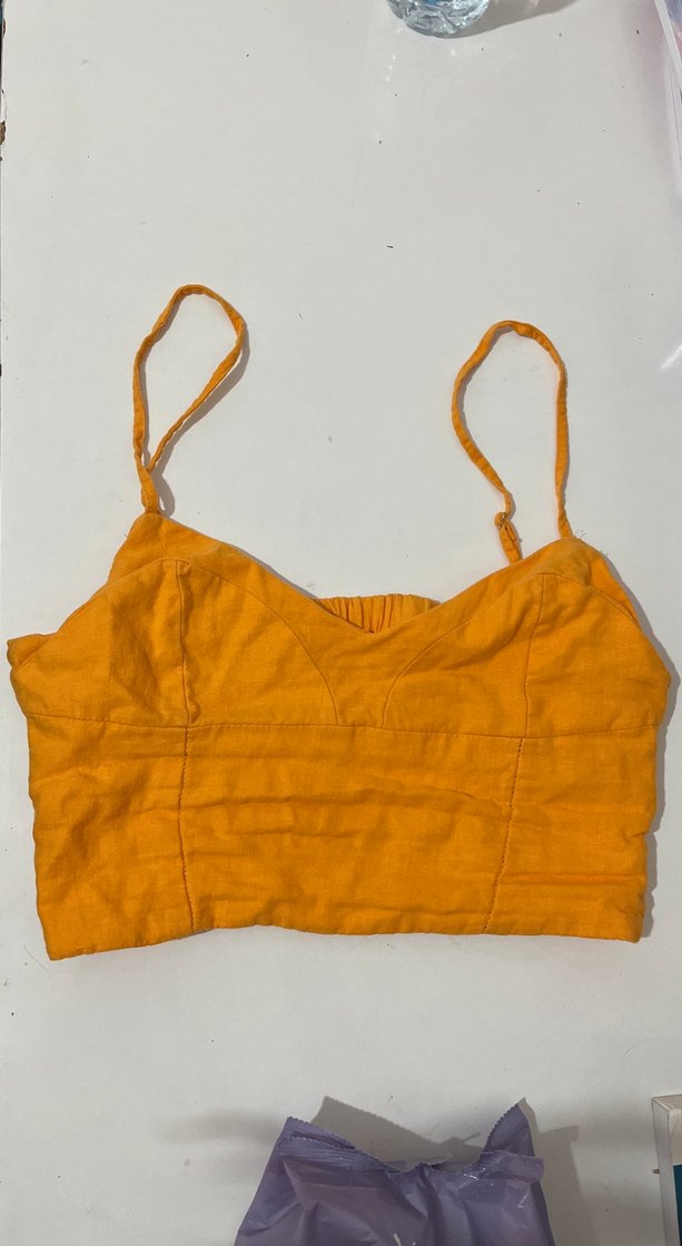 Turuncu keten kumaştan, ayarlanabilir ince askılı, straplez yakalı, günlük kullanıma uygun basic ve şık bir büstiyerdir.