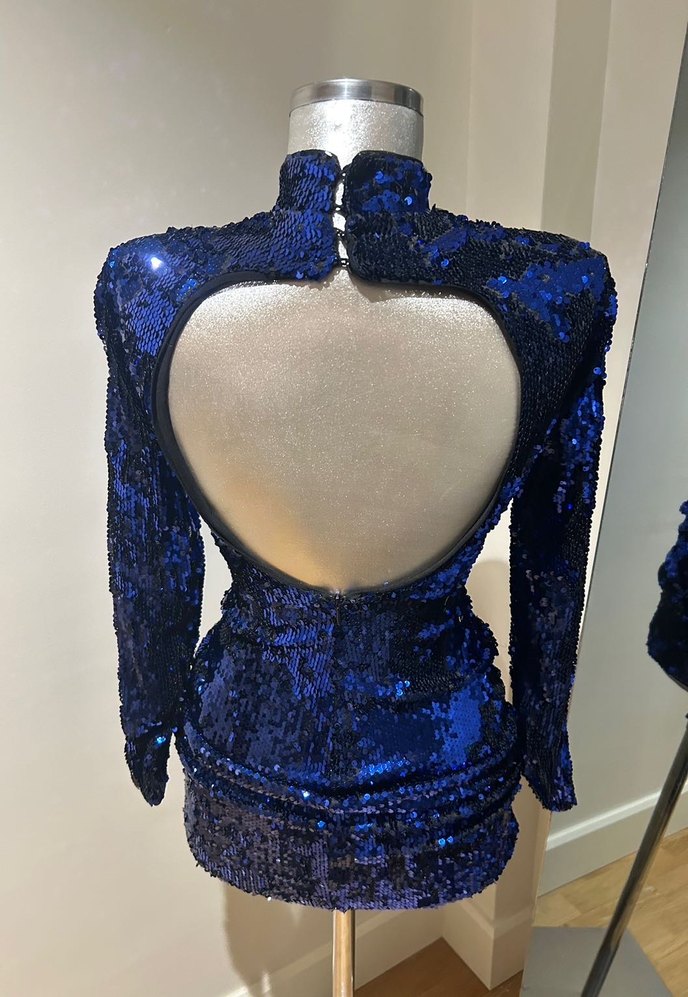 Uzun kollu, yüksek yakalı, mini kesim lacivert payetli dar kesim elbise. Cesur sırt dekoltesi ile avant-garde parti tarzına uygun. ✨ Sadece yılbaşında 1 kereligine giydim yeni gibi