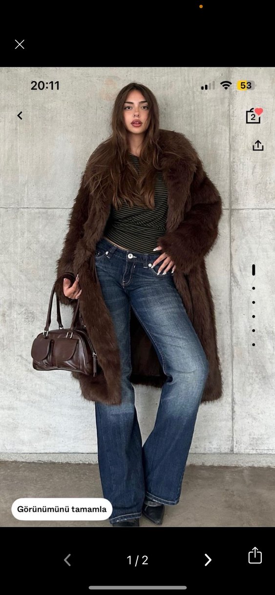 Kahverengi midi boy, yumuşak suni kürk detaylı, bol kesim ceket. Notlu yaka ve uzun kolludur, denim malzemeden üretilmiştir. Günlük rahat stil için uygundur.