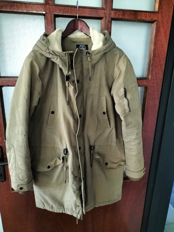 Bershka marka medium beden asker yeşili kapüşou kürklü uzun cepli parka kaban omuzunda ufak bir sökük ve kullanıma bağlı yıpranma mevcut #bershka #parka #kaban #mont #betshkamont #bershkaparka