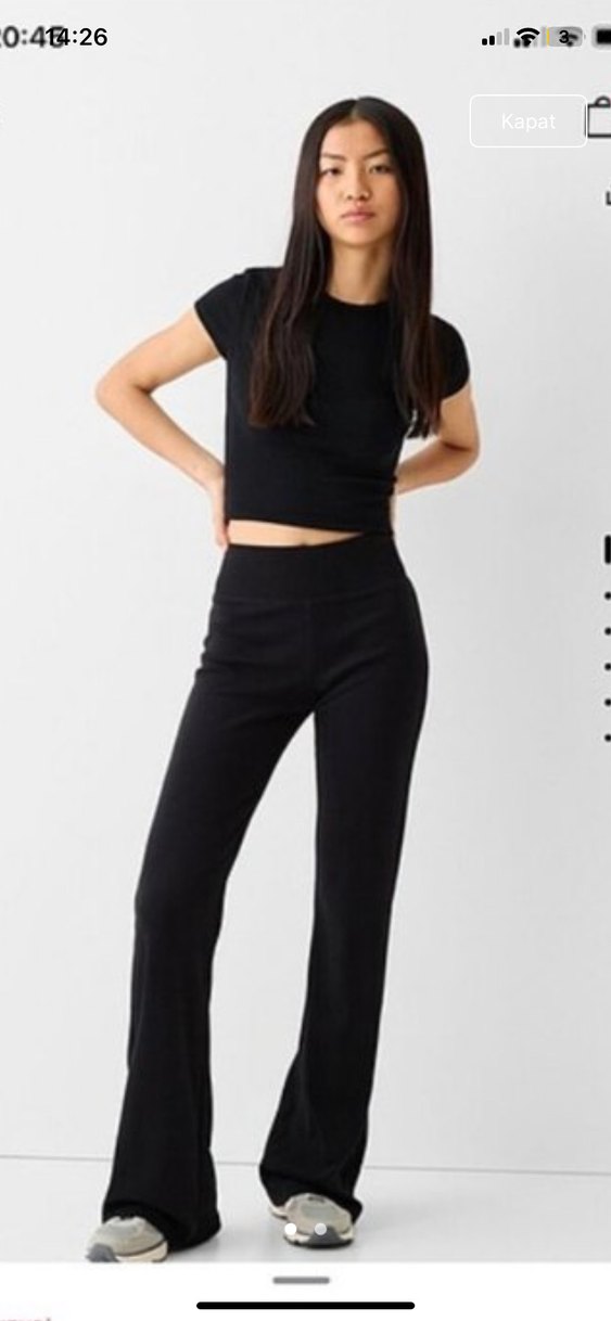 Siyah, fitted kesim ispanyol paça pantolon midi boyda, rahat ve şık bir görünüm sunar. Günlük kullanıma uygun, yumuşak sentetik kumaştan yapılmıştır.