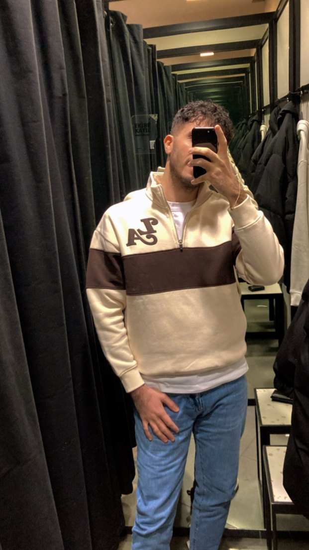 S veya M beden giyenler için tam uygundur. Yarım fermuarlı, yüksek yakalı, uzun kollu, bol kesim erkek sweatshirtü. Hafif kahverengi tonlarda, baskılı ve yumuşak sıcak kumaştan günlük kullanım için uygun.