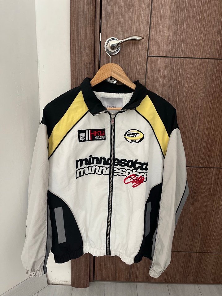Beyaz, gri ve sarı detaylı, fermuarlı ve baskılı kadın ceketi, dar kesim ve bisiklet yaka ile tasarlanmıştır. defosu yoktur.cok az giyilmiştir.s/m beden uyumlu