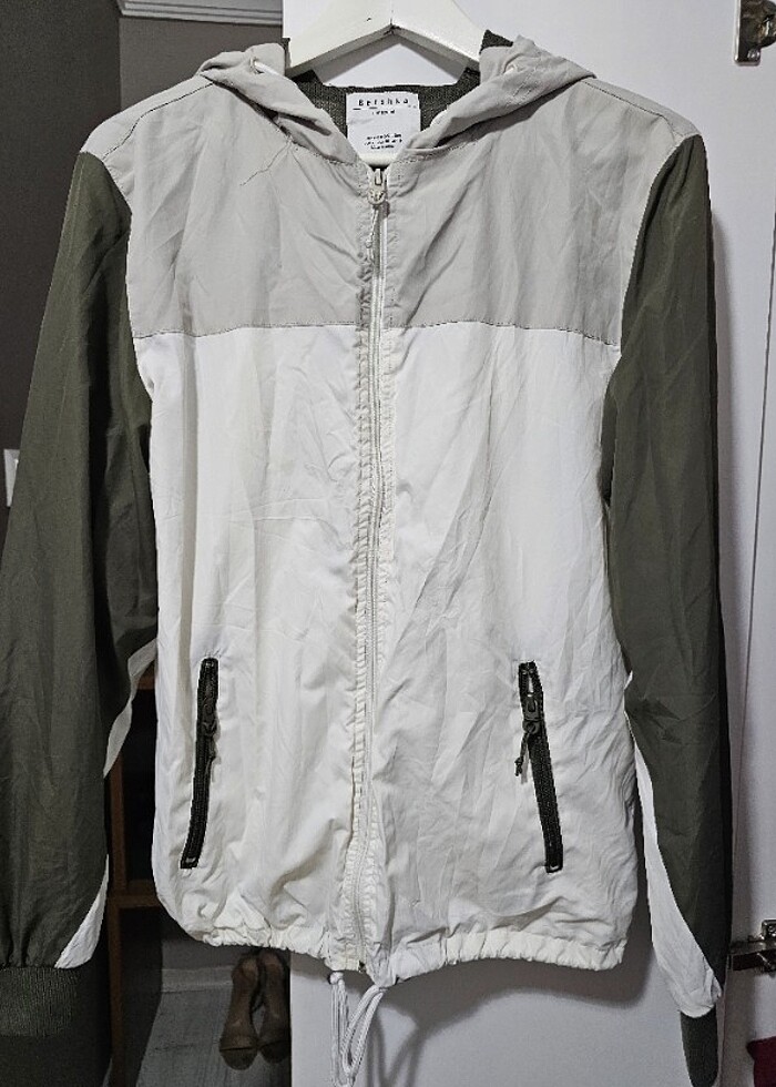 Astarlı kapşonlu cepler fermuarlı iki renkli haki ve bej m beden