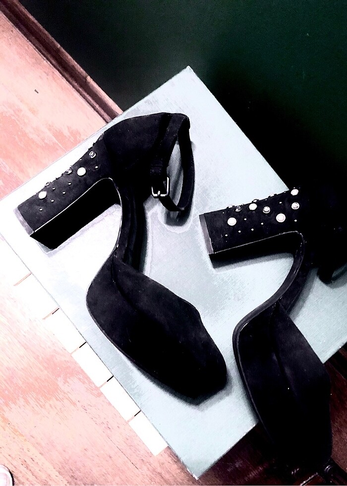 Bilekten bağlı süet siyah yeni platform kalın topuk ayakkabı. Topuklarında inciler var ve çok şık duruyor.