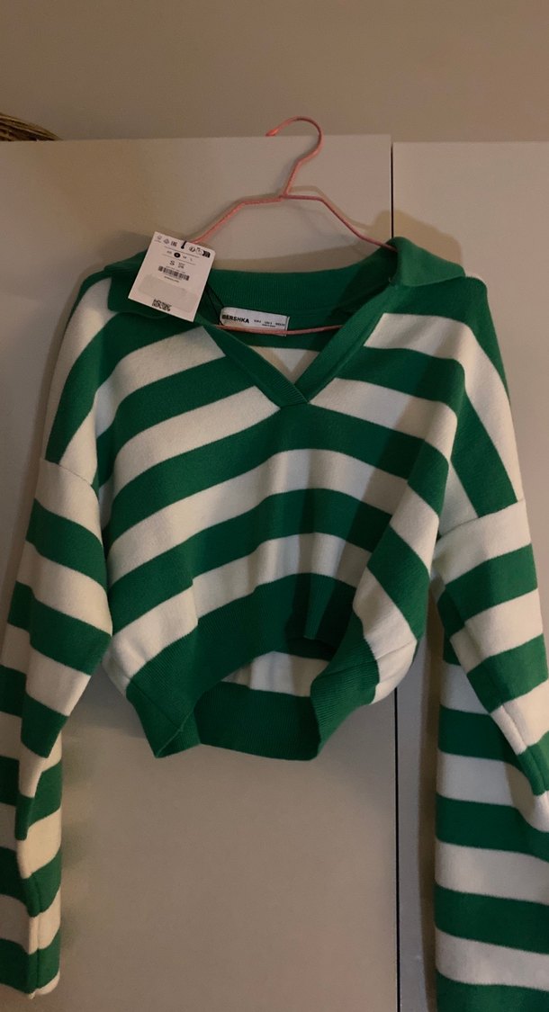 Yeşil beyaz çizgili, V yaka, uzun kollu örgü kazak. Salaş kesimi ve midi boyu ile rahat günlük kullanıma uygun. (Uygun tekliflere dönüyorum)