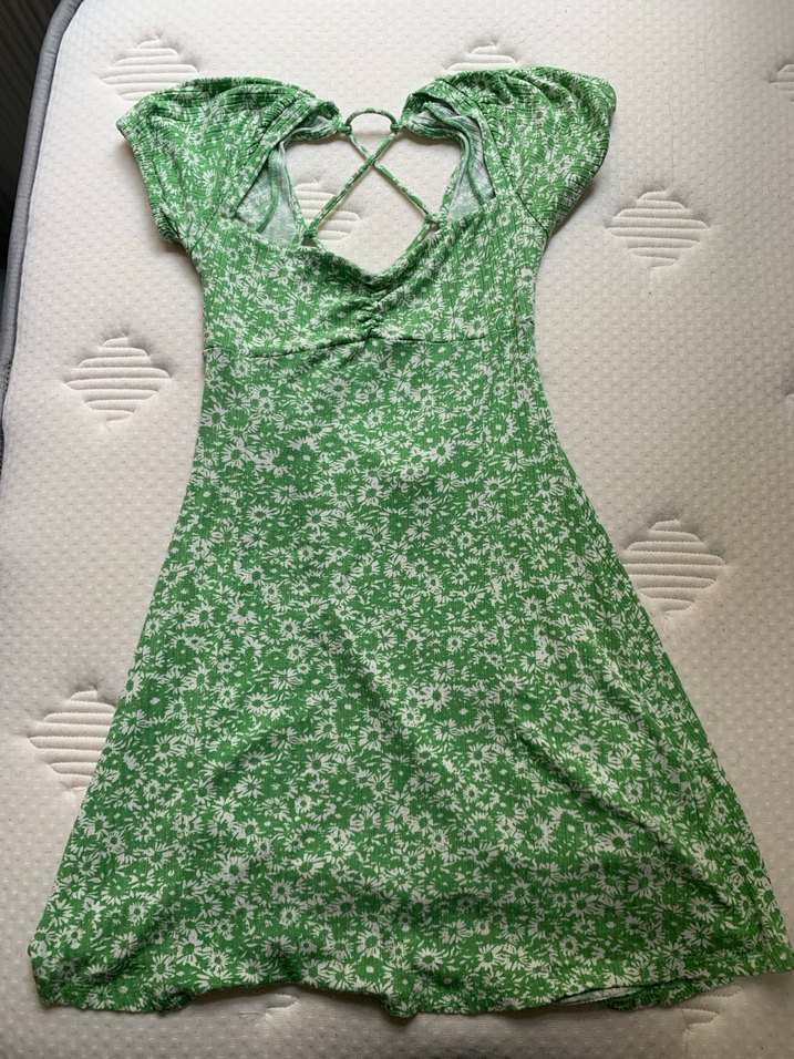 Arkadan bağlamalı mini yeşil çiçekli elbise