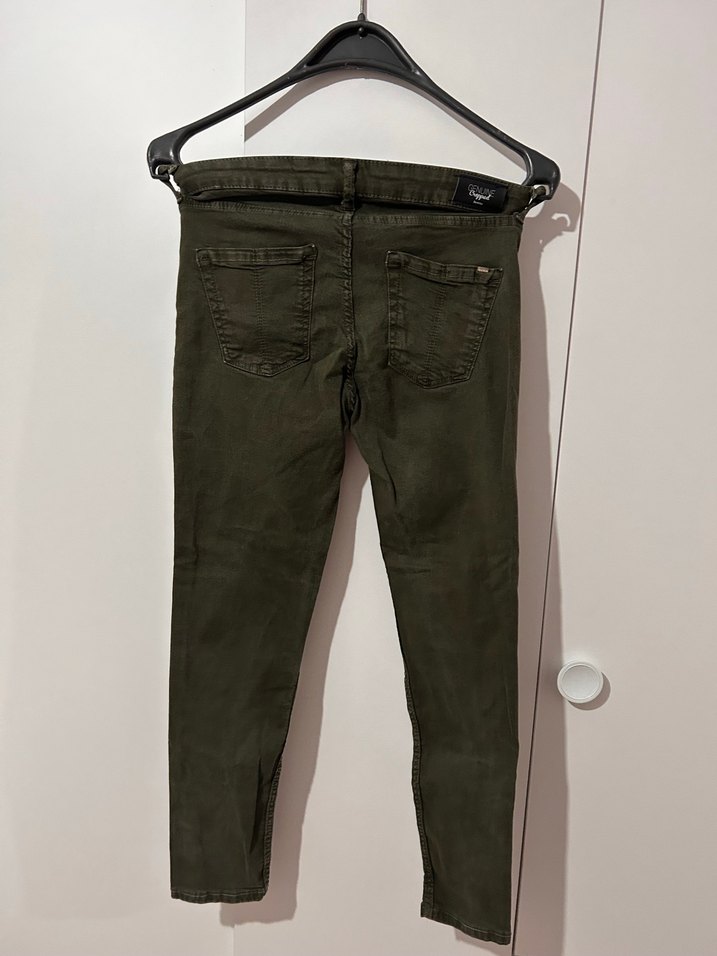 Hiç kullanmadım. Dar kesim, koyu yeşil kadın kot pantolon. Normal midi boy, günlük sokak stiline uygun rahat tasarım.