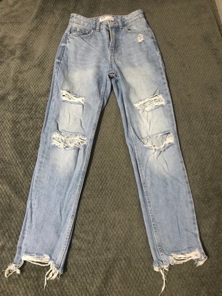Mavi denimden yapılmış, yırtık detaylı ve paçaları hırpalanmış bol kesim kadın jean. Günlük kullanıma uygun rahat stil.