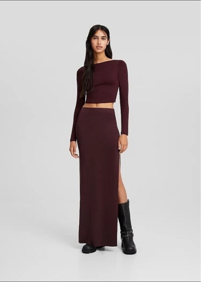 BERSHKA yırtmaçlı bordo etek ve üst takım