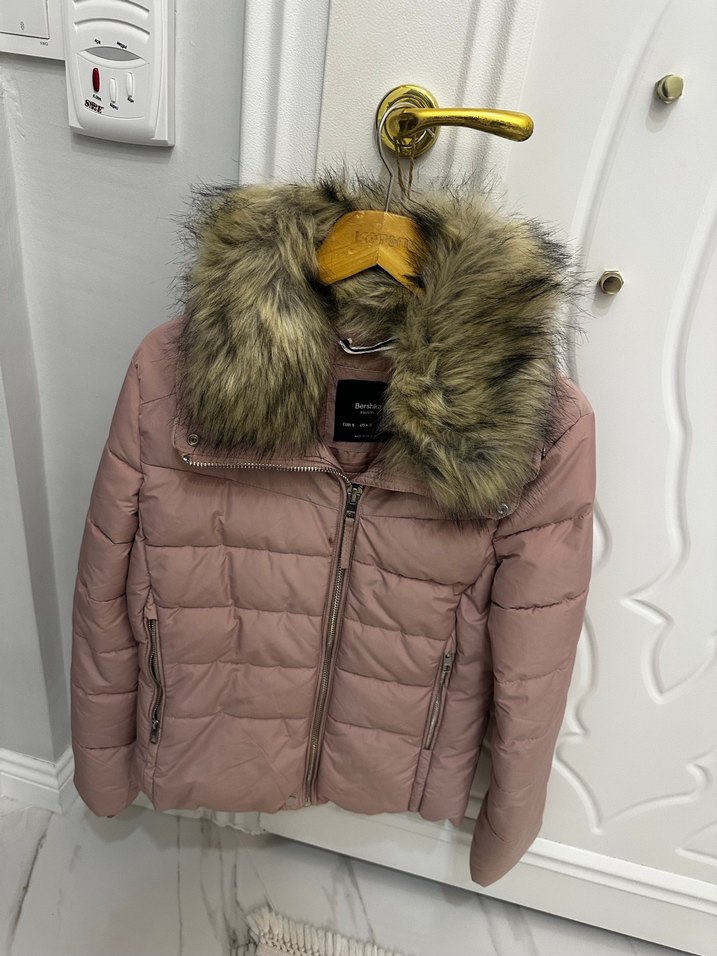 BershkaKürklü Bej Mini Kadın Kışlık Mont