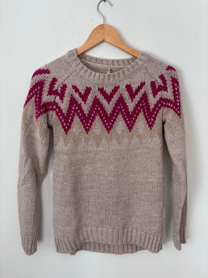 Uzun kollu, bisiklet yaka, mor pembe zigzag desenli bej örgü kadın kazak. Rahat kesimi ve günlük kullanıma uygun uzunluğu ile konfor sağlar.