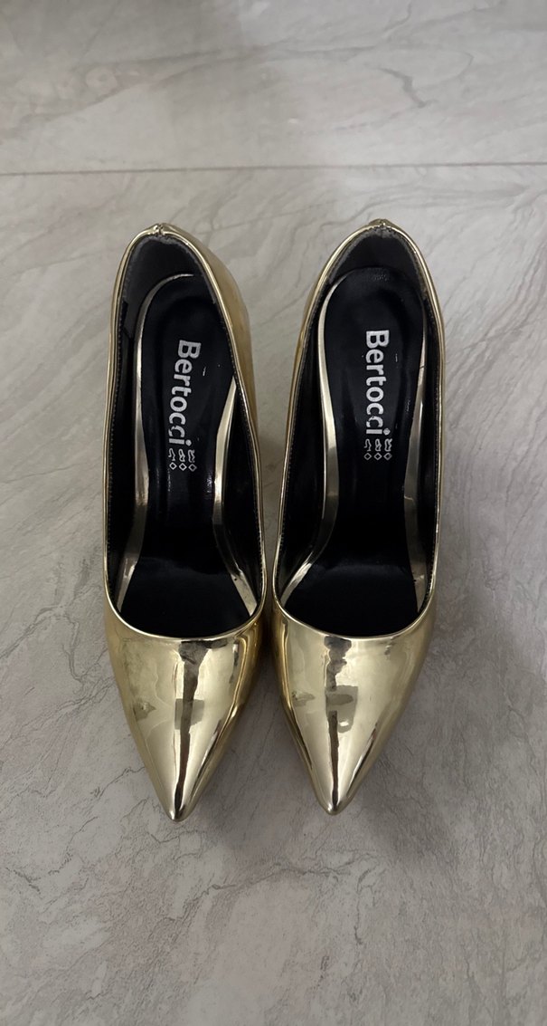 Bertocci markalı, tokalı ve parlak altın rengi stiletto topuklu ayakkabı, yılan desenli ve kauçuk malzemeden üretilmiştir. Sağ ayakkabı iç kısımda ufacık kahverengilik var…