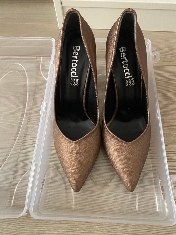 Bertocci bej stiletto topuklu ayakkabılar, plise detaylı ve parlak yüzeye sahip, modern klasik tarzda ofis için uygundur. Kauçuk malzemeden üretilmiştir.