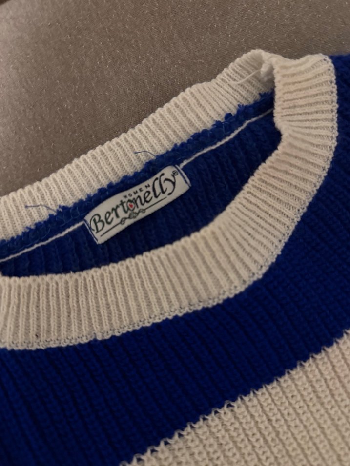 Bertonelly markalı, mavi ve gri renklerde, ince triko kumaştan, bisiklet yaka ve uzun kollu, fit kesim erkek çocuk kazak.