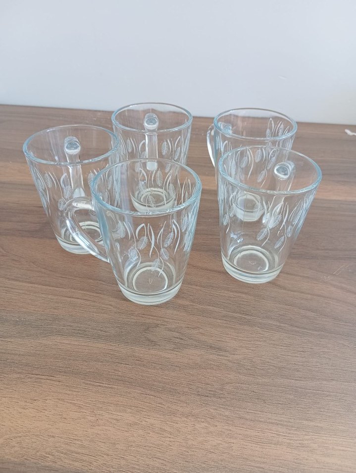 Beş parça, desenli cam bardak seti. Her bardakta tutma kulpu bulunmaktadır. Temizdir