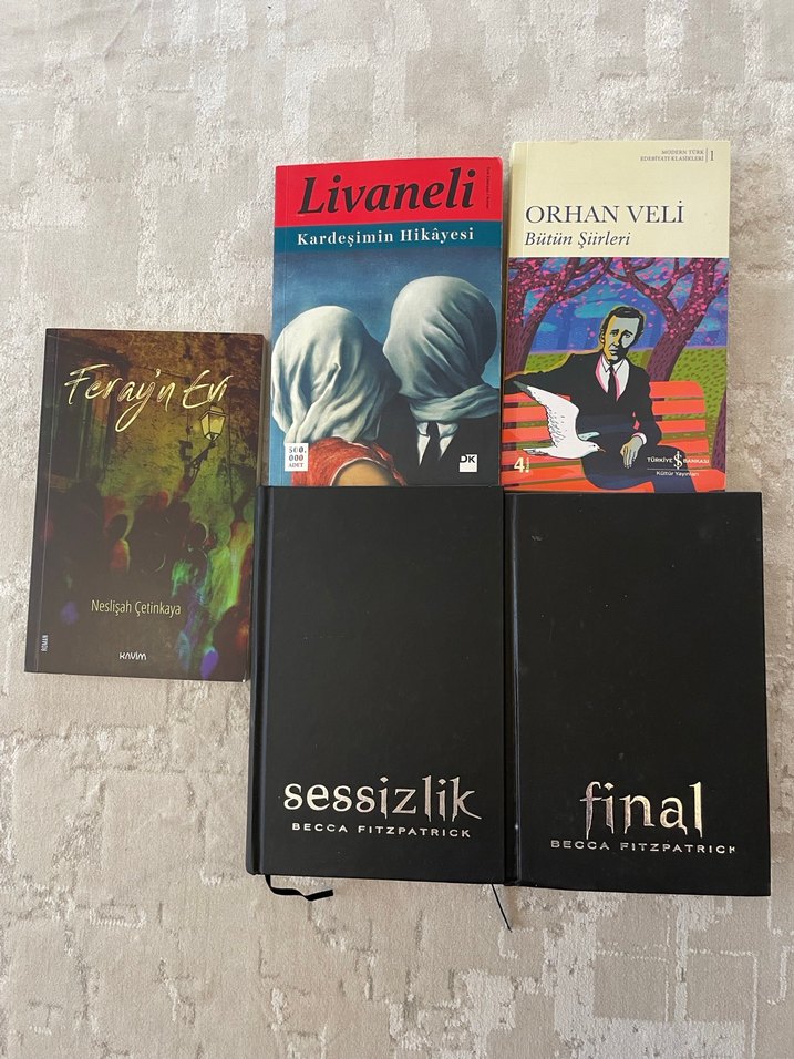 Becca Fitzpatrick'in 'Final' ve 'Sessizlik' romanları, Livaneli'nin 'Kardeşimin Hikayesi', Orhan Veli'nin 'Bütün Şiirleri' ve Neslişah Çetinakaya'nın 'Feray'ın Evi' kitaplarından oluşan beşli roman seti. Kütüphanemi boşaltıyorum. Diğer kitaplara da göz atabilirsiniz.