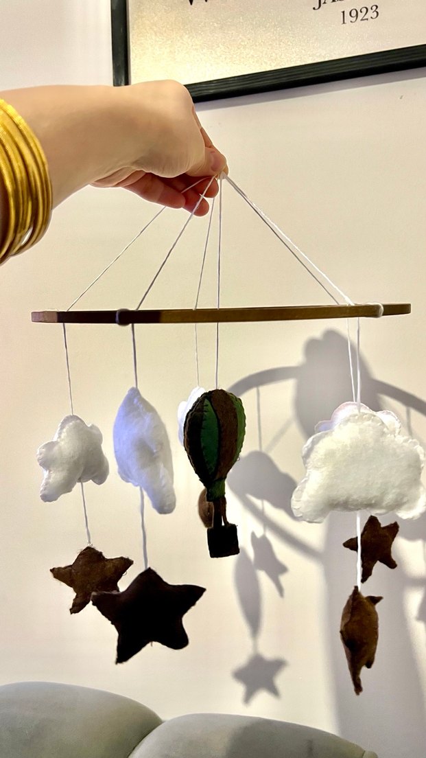 El yapımı bohem tarzda, yumuşak bulutlar, yıldızlar ve sıcak hava balonu detaylı ahşap halka sarkaç. Mekâna neşeli bir dokunuş katıyor. ☁️