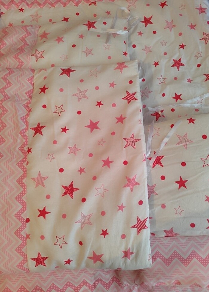 4 kenar koruyucusu ve bir elyaf yorgan. Kenarlardan bağlamak için kurdeleleri var. Hiç Bir kusuru yok. Büyüyen beşik ölçülerine uygun. Beşik ölçüleri 65x165
