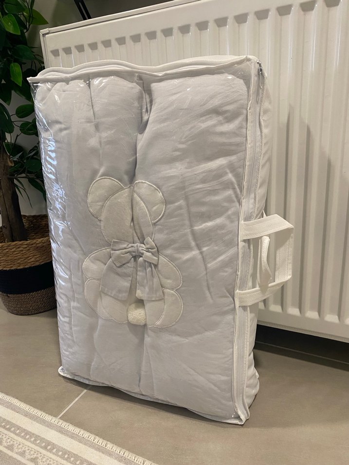 Nakışlı ayıcık desenli, yumuşak bebe mavisi pamuklu bebek beşik kenarlığı. Bağlama ipleri ile sabitlenebilir. Orijinal İtalyan Nanan markasıdır, 100% pamuktur, hiç bir kusuru yoktur hediye gelmişti 1 kere kullanıldı yıkayıp kaldırdık