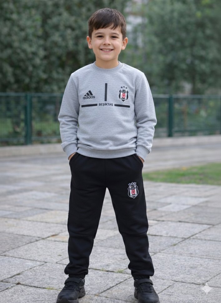 Gri triko dokulu, baskılı Beşiktaş logolu sweatshirt ve siyah detaylı eşofman altından oluşan, rahat kesimli erkek çocuk eşofman takımı.
