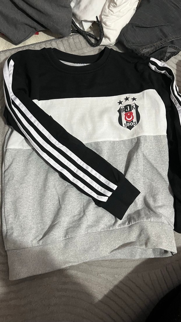Uzun kollu, bisiklet yaka ve fit kesim olan bu erkek sweatshirtü siyah, beyaz ve gri renklerde Beşiktaş baskısı ve çizgili kol detaylarına sahiptir. Yumuşak ve sıcak kumaştan üretilmiş, düğmeli detaylar bulunur. ⚽