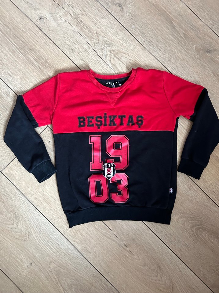 Kız çocukları için yuvarlak yaka, uzun kollu ve bol kesim sweatshirt. Yumuşak, sıcak kumaştan örülmüş, kırmızı ve siyah renkte "BESIKTAS" ve 1903 baskılıdır.
