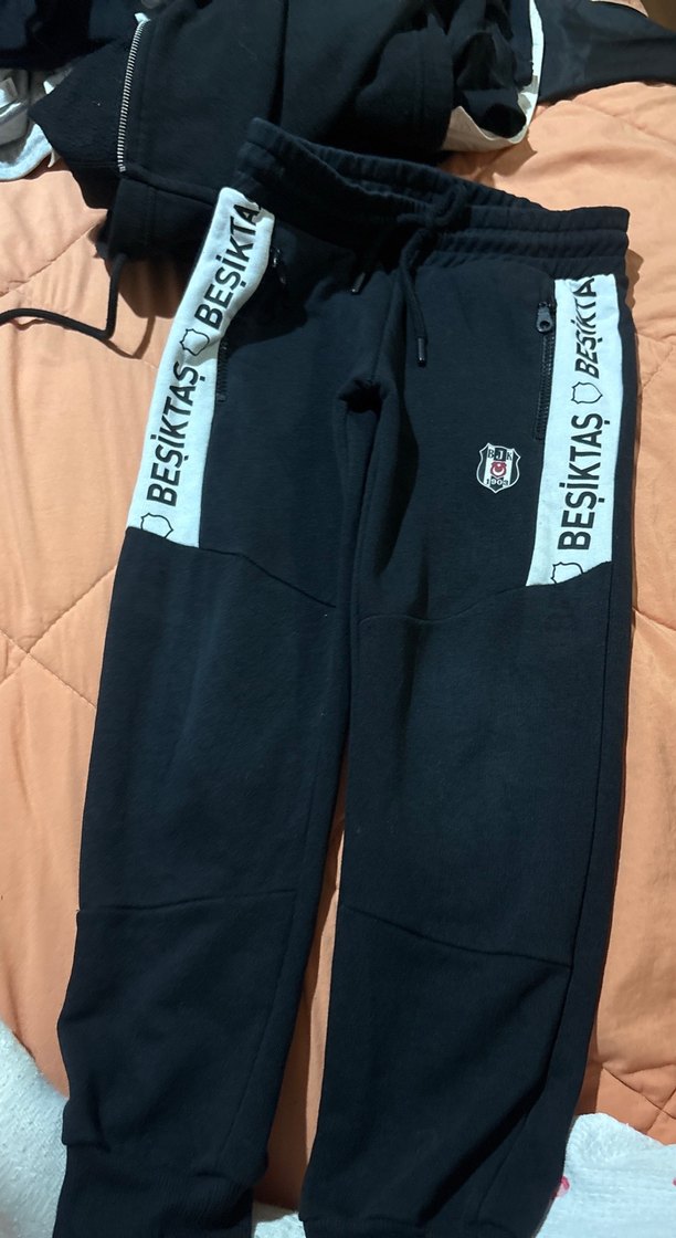 Sentetik kumaştan, bel detaylı ve Beşiktaş baskılı siyah erkek çocuk eşofmanı. Rahat ve bol kesim.