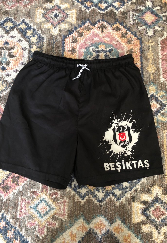 Beşiktaş baskılı, kemerli bel ve bol kesim siyah erkek mini şort, plajda rahat kullanım için uygun.