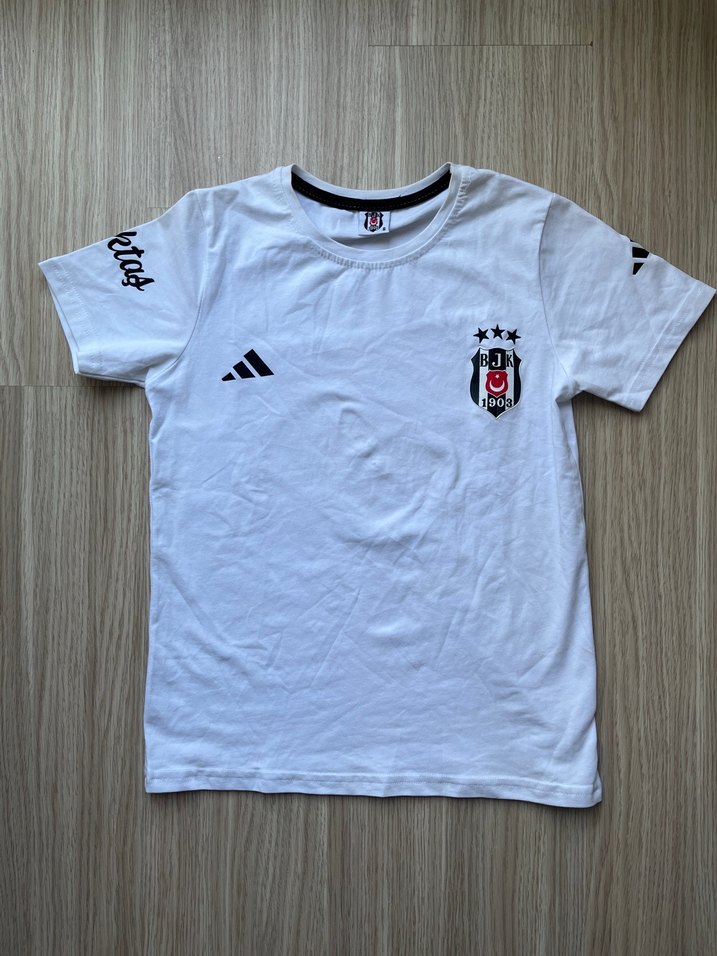 Beyaz pamuklu tişört, kısa kollu ve yuvarlak yaka. Beşiktaş baskılı, rahat kesim, spor ve günlük kullanıma uygun. ⚽