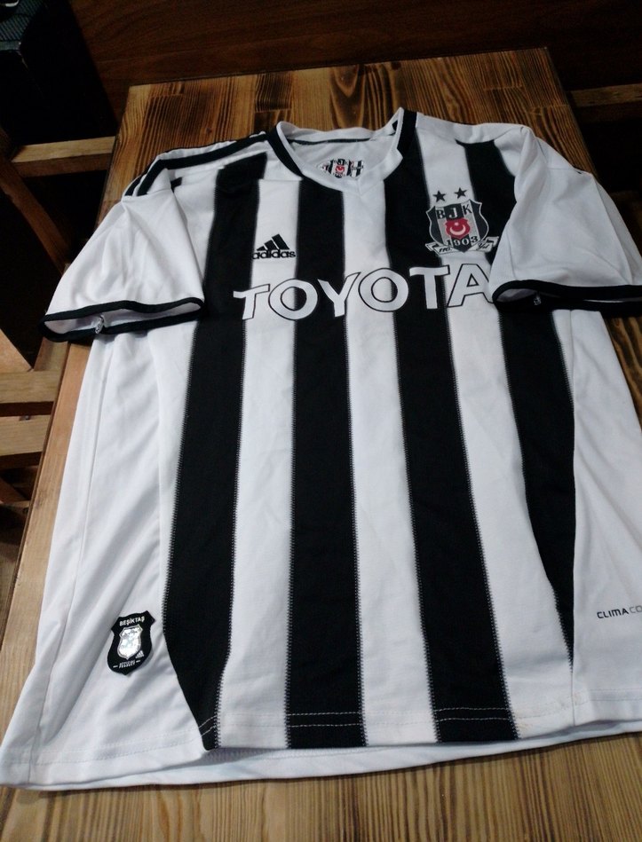 Kısa kollu, bisiklet yaka ve baskılı siyah-beyaz dikey çizgili fit kesim erkek forma. "TOYOTA" logosu ve spor amblemi içerir, sentetik kumaştan yapılmıştır. ⚽