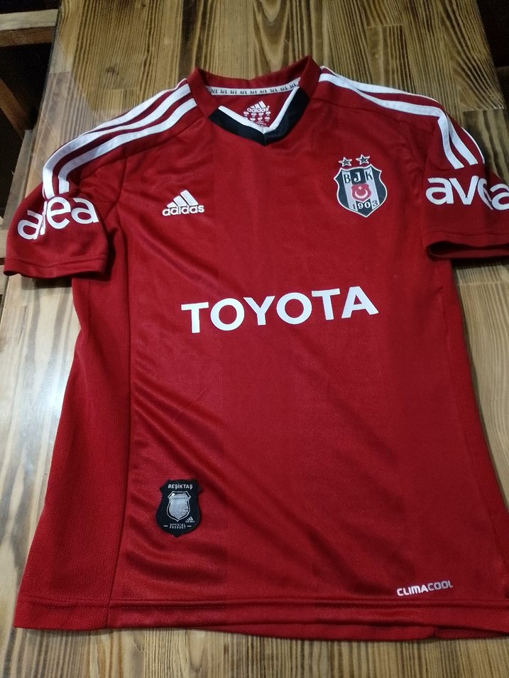 Koyu kırmızı sentetik kumaştan, kısa kollu ve yuvarlak yakalı, baskılı desenli, düğmeli detaylı Beşiktaş amblemi ve TOYOTA logosu bulunan, sportif ve sokak stili uyumlu dar kesim erkek forma.